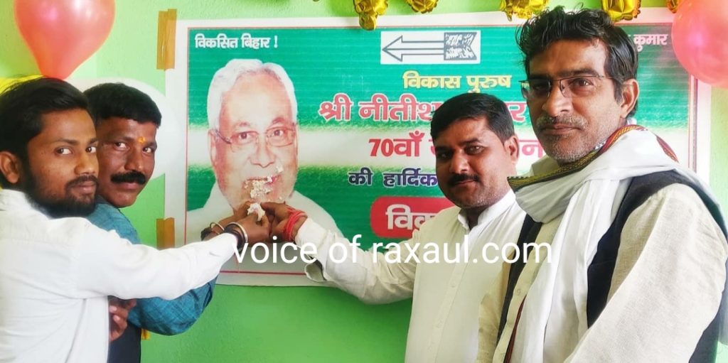 रक्सौल।(vor desk)।बिहार के मुख्यमंत्री नीतीश कुमार की 70 वां जन्म दिवस धूम धाम से मनाया गया।उनका जन्म दिवस इस बार विकास दिवस के रूप में मनाया गया। सोमवार को रक्सौल प्रखण्ड अध्यक्ष डॉ. सौरव कुमार राव के अध्यक्षता में ग्राम चिकनी स्थित आवासीय कार्यालय में जन्मदिन समारोह मनाया गया। उक्त अवसर पर मुख्य अतिथि के रूप में प्रदेश से नियुक्त रक्सौल बिधानसभा प्रभारी मान मिश्रा एवं चनपटिया बिधानसभा प्रभारी महमद एहतेशाम को अंग-वस्त्र व फुलमाला से सम्मानित किया गया। इस अवसर पर रक्सौल विधानसभा प्रभारी श्री मिश्रा ने कार्यकर्ताओं को संबोधित करते हुए कहा कि आज के दिन पूरे बिहार में जदयू कार्यकर्ता विकास दिवस के रूप में मना रहे हैं।उन्होंने मुख्यमंत्री नितीश कुमार के द्वारा चलाए जा रहे विकास मुखी कार्यों को जन-जन तक पहुँचाने के लिए कार्यकर्ताओं का आह्वान किया।