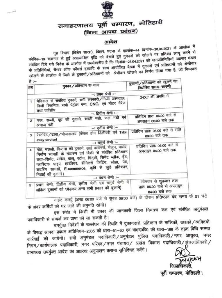 मोतिहारी/रक्सौल ।( vor desk )।कोविड-19 के संक्रमण में लगातार इजाफा व मौत एवं उक्त बीमारी से संभावित खतरे के मद्देनजर पूर्वी चंपारण जिला प्रशासन ने 30 अप्रैल( शुक्रवार )को दुकानों को खोलने के लिए नए गाइड लाइंस जारी किए हैं।यह 23 अप्रैल को जारी आदेश का संसोधित आदेश है।बाजार में भीड़ भाड़ को नियंत्रित करने के लिए जनप्रतिनिधियों, व्यापार मंडल के प्रतिनिधियों व चेंबर ऑफ कॉमर्स के इत्यादि के साथ बैठक के बाद जिले के दुकानों/प्रतिष्ठानों को खोलने के लिए तालिका निर्धारित की गई है।