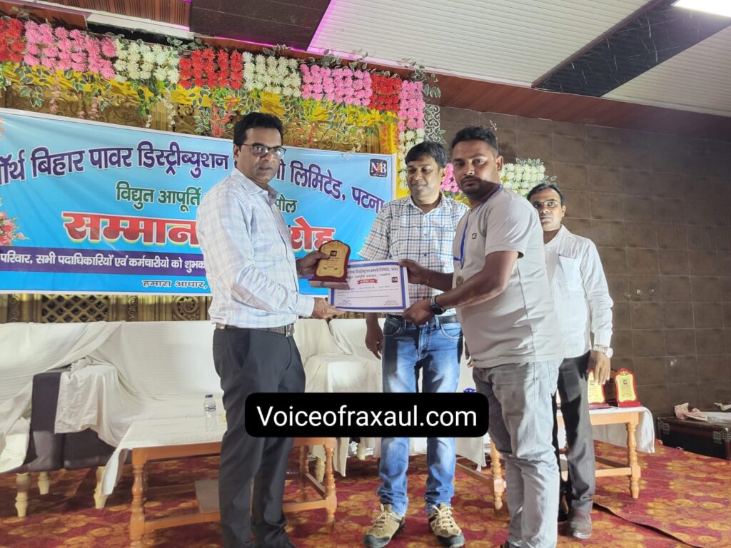 रक्सौल।(Vor desk)।नॉर्थ बिहार पॉवर डिस्ट्रीब्यूशन कंपनी लिमिटेड के तत्वाधान में बुधवार को शहर के वाई एस रिसॉर्ट हॉल में सम्मान समारोह का आयोजन हुआ। इसका आयोजन विद्युत आपूर्ति प्रमंडल रक्सौल अंतर्गत गत मार्च माह में हुए राजस्व संग्रहण के लक्ष्य को शत प्रतिशत हासिल करने के उपलक्ष्य में किया गया। इस दौरान राजस्व कलेक्शन में बेहतर परफॉर्मेंस करने वाले कर्मचारियों, मीटर रीडरों, मानव बलों एवं पर्यवेक्षको को मोमेंटो तथा प्रशस्ति पत्र देकर सम्मानित किया गया। इस समारोह में बतौर मुख्य अतिथि मोतिहारी से आए विद्युत अधिक्षण अभियंता गौतम गोविंदा के हाथों सम्मान पाकर सभी प्रतिभागी आत्मविश्वास से लवरेज दिखे। इस दौरान रक्सौल के कार्यपालक अभियंता अजय कुमार के नेतृत्व में किए गए बेहतर परिणाम के मद्देनजर श्री गौतम ने उनके कार्यकुशलता की प्रशंसा की। कहा कि इस डिविजन अंतर्गत रक्सौल एवं घोड़ासहन सब डिविजन तथा सभी सेक्शनों ने बढ़िया टीमवर्क का परिचय दिया है। समारोह के दौरान मोतिहारी, चकिया, बेतिया डिविजनों के कार्यपालक अभियंताओं, सहायक अभियंता एवं अन्य अधिकारियों ने हिस्सा लेकर सभी को सफलता के आवश्यक टिप्स दिए। मौके पर सहायक विद्युत अभियंता सुनील रंजन, आलोक कुमार, प्रीतम कुमार बंटी, मनोज कुमार, रवि कुमार, बबलू कुमार, मो. ग़ालिब के अलावा जोनल मैनेजर अभिषेक पांडेय, संजय कुमार, सुपरवाइजर रजनीश कुमार ठाकुर, प्रमोद कुमार, लव कुमार, ऋषिकेश कुमार, हुजैफा मंजर सहित सैकड़ों की संख्या में एमआरसी, मानव बल व अन्य मौजूद रहे।