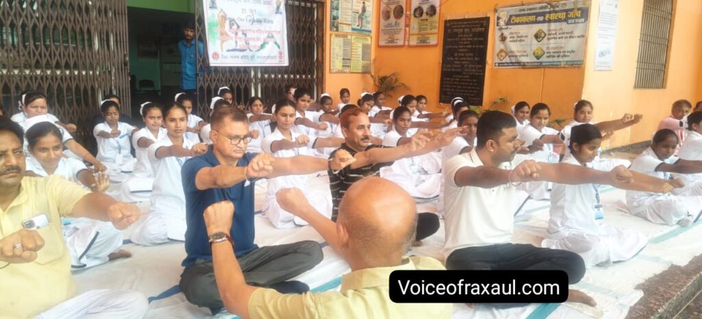रक्सौल।(Vor desk)। रक्सौल स्थित अनुमंडल अस्पताल में 11वें अंतर्राष्ट्रीय योग दिवस मनाया गया। योग शिविर सह योग जागरूकता कार्यक्रम का शुभारंभ अनुमंडल अस्पताल उपाधीक्षक सह प्रभारी चिकित्सा पदाधिकारी डॉ राजीव रंजन कुमार ने किया।इस मौके पर चिकित्सक, स्वास्थ्य कर्मी, एएनएम स्कूल की नर्सिंग स्टूडेंट्स ने सामूहिक रूप से योगाभ्यास किया।