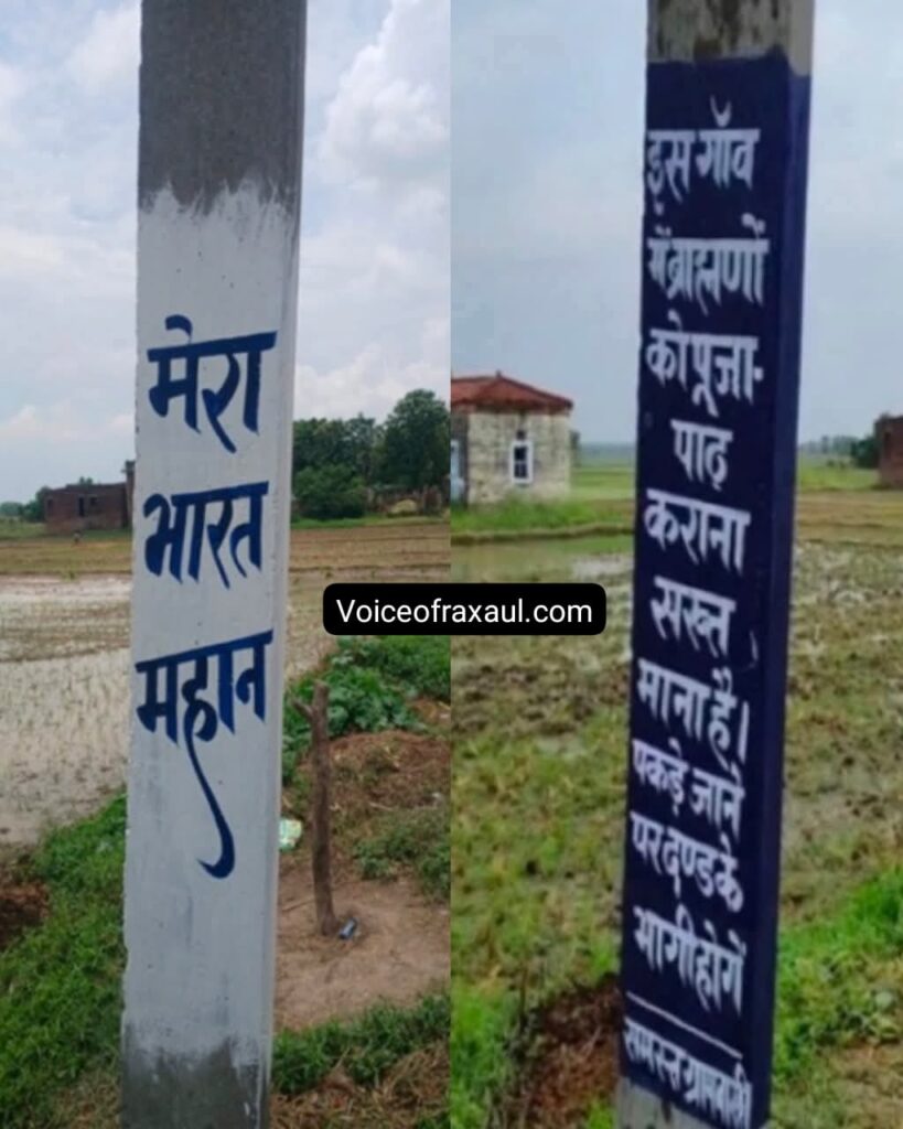 रक्सौल।(Vor desk)।यूपी के इटावा में कथा वाचक मुकुट मणि सिंह के साथ दुर्व्यवहार और बदसलूकी की गूंज बिहार तक पहुंच चुकी है।नेपाल सीमा से लगे बिहार के पूर्वी चंपारण जिले के आदापुर थाना क्षेत्र के टिकुलिया गांव के लोगों ने ब्राह्मणों के पूजा-पाठ पर बैन लगा दिया है। ग्रामीणों ने गांव में बोर्ड और बैनर लगाकर ब्राह्मणों को ऐसा करने से मना किया है। कहा गया है कि जिन्हें वेद ,धर्म और संस्कारों का पूरा ज्ञान होगा,उन्हें ही पूजा करने दिया जाएगा।चेताया गया है कि इसका उल्लंघन करते पकड़े जाने पर परिणाम भुगतना होगा।