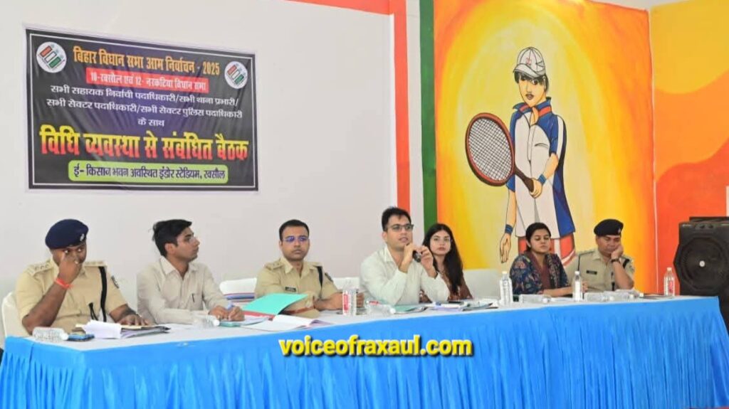 रक्सौल ।(Vor desk)। चुनाव आयोग के निर्देश पर पूर्वी चम्पारण प्रशासन ने बिहार विधानसभा की चुनावी तैयारी तेज कर दी है।इसी क्रम में बुधवार को रक्सौल के इनडोर स्टेडियम में पूर्वी चंपारण के जिला निर्वाचन पदाधिकारी सह जिलाधिकारी सौरभ जोरवाल और एसपी स्वर्ण प्रभात के नेतृत्व में 10- रक्सौल एवं 12-नरकटिया विधानसभा क्षेत्र के चुनाव की तैयारी के मद्देनजर समीक्षा बैठक आयोजित की गई,जिसमे निर्वाची पदाधिकारी ,सहायक निर्वाची पदाधिकारी, सेक्टर पदाधिकारी एवं सेक्टर पुलिस पदाधिकारी मौजूद रहे।