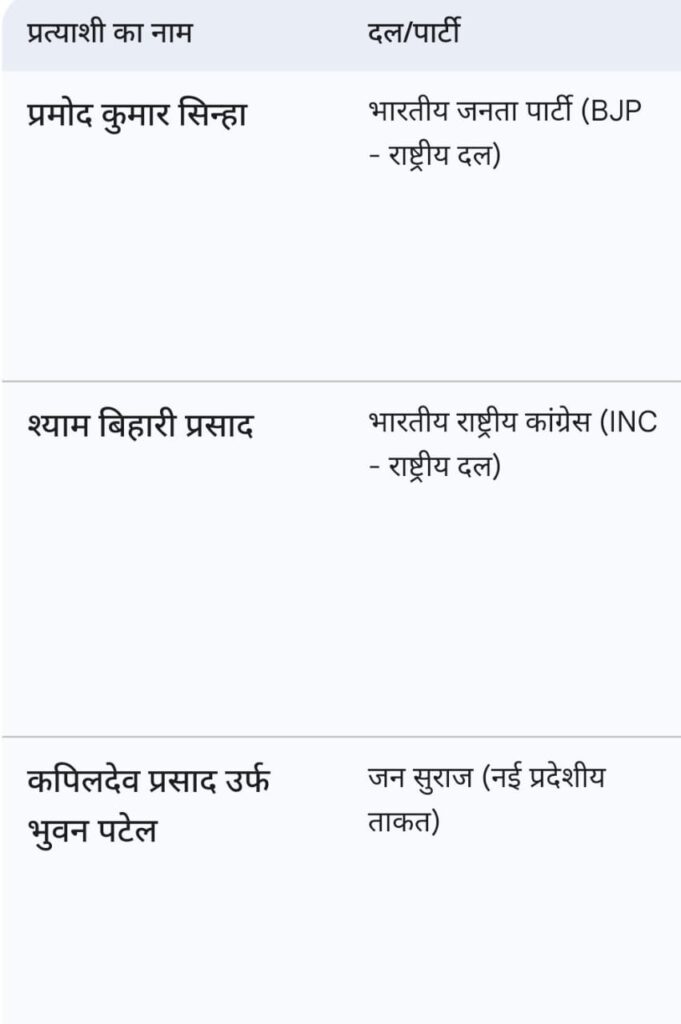 नामांकन रद्द होने के बाद अब रक्सौल के चुनावी अखाड़े में मुख्य रूप से तीन प्रमुख चेहरे मुकाबले में हैं।इसमें भाजपा के प्रमोद सिन्हा(सीटिंग विधायक) ,कांग्रेस के श्याम बिहारी प्रसाद (पूर्व मंत्री)के बीच कांटे का टक्कर तय है।जन सुराज के कपिलदेव प्रसाद उर्फ भुवन पटेल की उपस्थिति चुनाव को रोचक बना रही है,और परिणाम में उल्ट फेर कर सकती है।