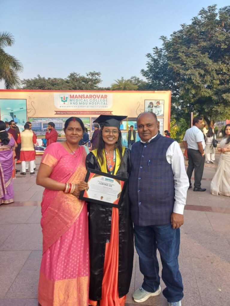 अपनी सफलता की गाथा लिखते हुए, निशा ने मध्य प्रदेश के मानसरोवर डेंटल कॉलेज से बीडीएस की डिग्री हासिल की। बड़ी बात यह है कि उन्होंने इस दौरान सभी सेमेस्टर की परीक्षाओं में प्रथम स्थान प्राप्त किया। इसी महीने की तेरह तारीख को संपन्न हुए दीक्षांत समारोह में, निशा को मध्य प्रदेश सरकार में विधानसभा स्पीकर नरेन्द्र सिंह तोमर के हाथों बीडीएस की मानद डिग्री प्रदान की गई। निशा ने अपनी इस शानदार सफलता का श्रेय अपने पूज्य पिता ओमप्रकाश मिश्रा, माता संजू मिश्रा और अपने सभी गुरुजनों को दिया है।