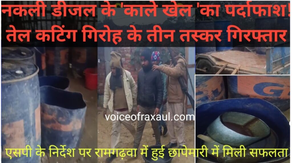 रक्सौल।(Vor desk)। बिहार के पूर्वी चंपारण में पुलिस ने अंतरराष्ट्रीय तेल तस्करी और मिलावट के एक बड़े सिंडिकेट को ध्वस्त किया है। रामगढ़वा थाना क्षेत्र के मझरिया गांव में चल रहे एक संगठित तेल कटिंग गिरोह का भंडाफोड़ करते हुए पुलिस ने तीन मुख्य तस्करों को रंगे हाथ दबोचा है। यह गिरोह न केवल नेपाली टैंकरों से तेल की चोरी करता था, बल्कि घातक केमिकल मिलाकर नकली डीजल भी तैयार कर रहा था।