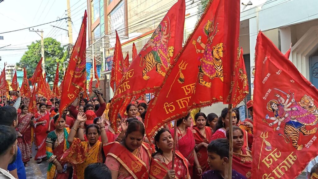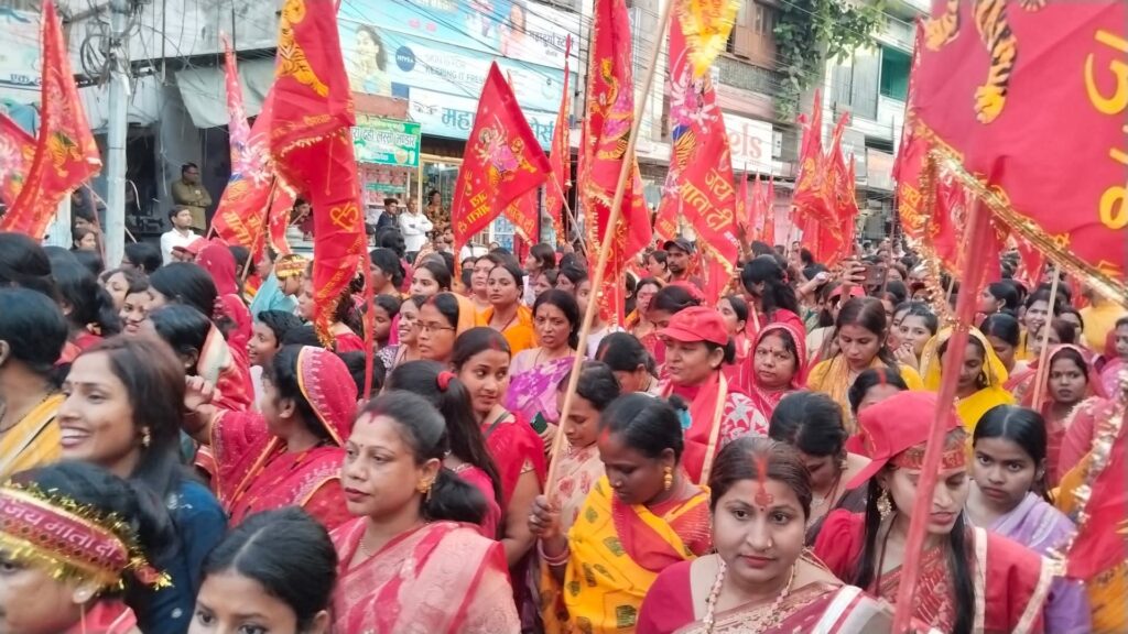 भक्तों का हुजूम: लाल वस्त्रों में सजे सैकड़ों महिला-पुरुष श्रद्धालु हाथों में जय माता दी अंकित भगवा ध्वज लेकर झूमते-गाते चल रहे थे।