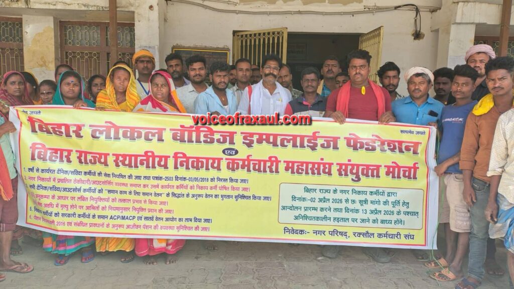 रक्सौल (VOR DESK): केंद्र सरकार द्वारा लागू किए गए चार नए लेबर कोड (श्रम संहिता) के विरोध में रक्सौल नगर परिषद के सफाईकर्मियों ने गुरुवार को मोर्चा खोल दिया। बिहार राज्य स्थानीय निकाय कर्मचारी महासंघ (एक्टू) और बिहार लोकल बॉडीज इम्प्लाइज फेडरेशन संयुक्त मोर्चा के आह्वान पर आयोजित इस प्रदर्शन में बड़ी संख्या में महिला एवं पुरुष सफाईकर्मियों ने हिस्सा लिया और छह सूत्री मांगों को लेकर नगर परिषद कार्यालय के मुख्य गेट पर जमकर नारेबाजी की।