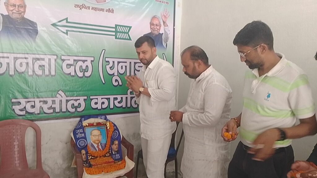 रक्सौल।(Vor desk)। भारतीय संविधान के शिल्पी और समानता व न्यायपूर्ण समाज की आधारशिला रखने वाले भारत रत्न डॉ. भीमराव अंबेडकर की 135वीं जयंती रक्सौल स्थित जदयू कार्यालय में अत्यंत हर्षोल्लास के साथ मनाई गई। इस अवसर पर पार्टी नेताओं और कार्यकर्ताओं ने बाबा साहेब के चित्र पर पुष्प अर्पित कर उन्हें नमन किया और मिठाई बांटकर खुशियां साझा कीं।